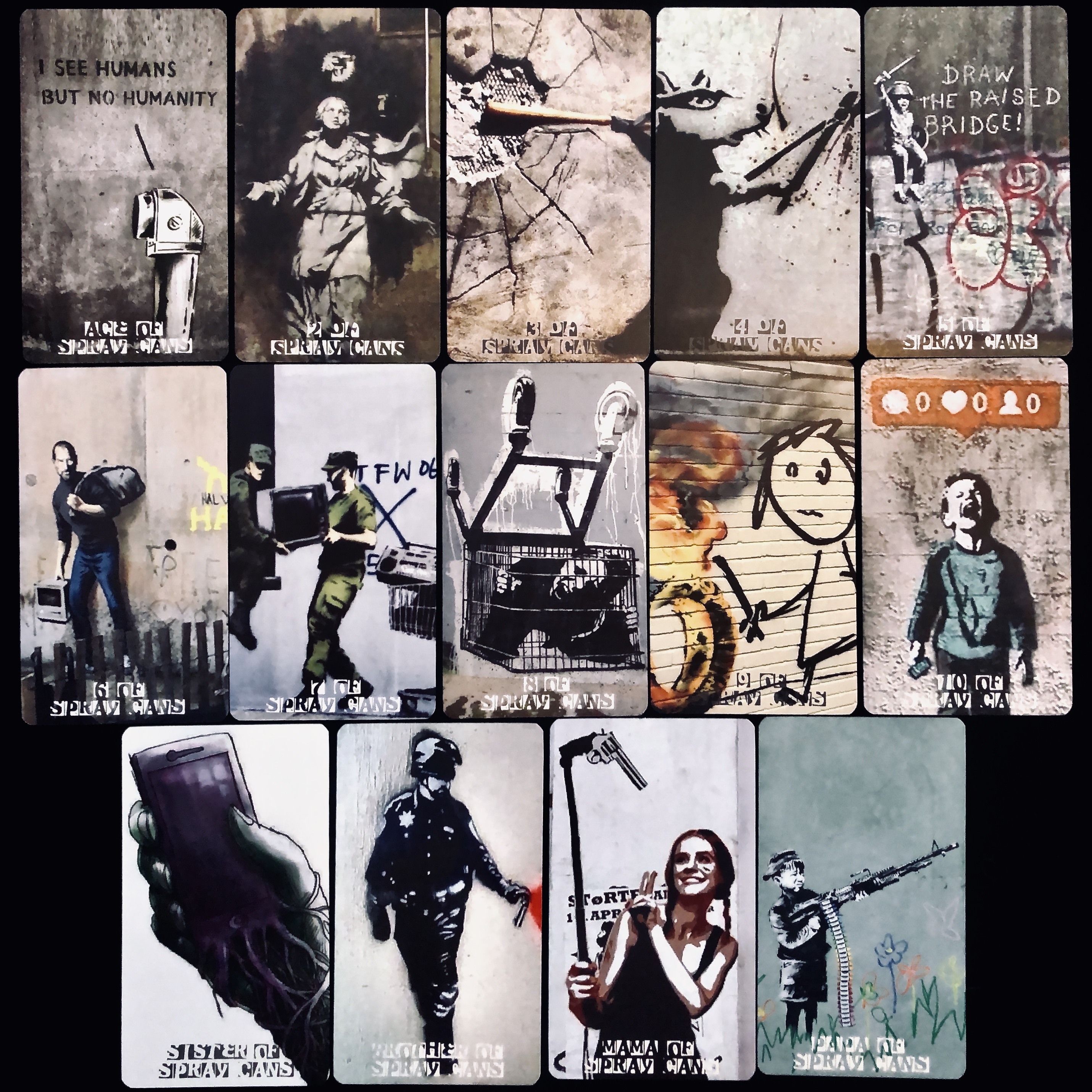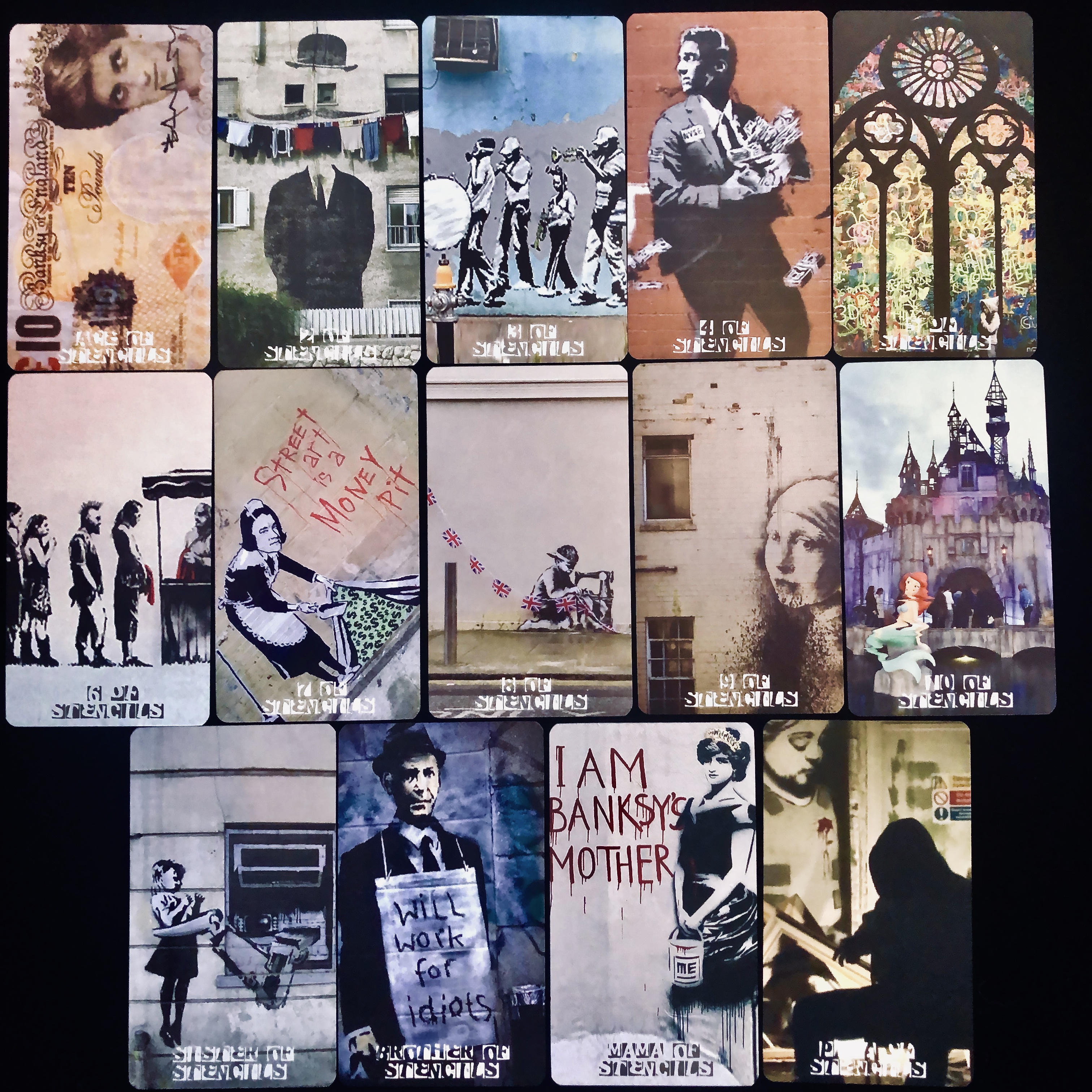 Produced over a period of 10 years, between 2008 and 2018, The Banksy Tarot is a fully functional deck that follows in the Rider-Waite tradition. This deck is comprised of the anonymous street artist’s/ social activist’s painted characters, objects, and locations where his paintings reside, and are an examination of archetype, as well as humankind’s history and future. The cards are powerful because They speak to us at the soul level, they question our beliefs and sometimes our fears, and challenge us to be better and do better; they act as triggers for personal truths. This deck transcends race, gender, sexual orientation, community, and even country. The cards provide a marginal space between the real world and one’s interior landscape, and will challenge all people on many levels. So many characters are presented in the deck, including historical and religious figures, children, men and women of all nationalities, color, and sexual orientation. The cards act as an allegory for love, loss, hardship, reward, etc.; the images allow one to see one’s own path and story through the artwork and symbolism of Banksy.